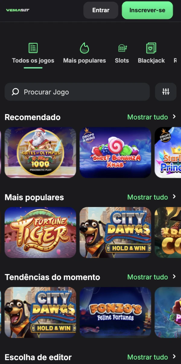 Concebemos a nossa plataforma móvel para parecer um casino completo no seu bolso, e não uma versão limitada do site. Com a Vemabet, pode alternar entre apostas desportivas e jogos de casino sem perder velocidade nem nitidez, mesmo em ecrãs mais pequenos. A nossa biblioteca inclui cerca de 8.000 jogos, com estúdios de topo como Pragmatic Play, NetEnt, Evolution, Play'n GO, Red Tiger, Nolimit City, Hacksaw Gaming, Push Gaming, Relax Gaming e Big Time Gaming. Nas slots, vemos frequentemente um RTP médio a rondar os 97%, e jogos de mesa como blackjack podem chegar a 99,6% de RTP em variantes específicas.